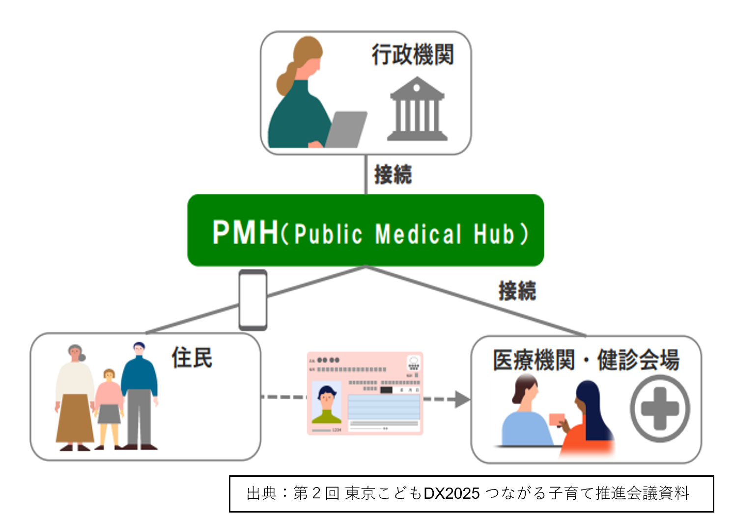 Public Medical Hub(PMH)は、デジタル庁が開発した情報連携基盤です。自治体や医療機関等がPMH接続を行うことで、住民は各種医療費助成、予防接種、母子保健等について、マイナンバーカードによる資格確認、マイナポータルからの問診票・予診票入力や接種履歴・健診結果の確認等を行うことが可能になります。
