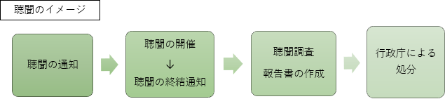 - 不利益処分を行う前に設けられる、相手方が意見を述べる機会をいいます。聴聞の場合は口頭で、弁明の場合は文書で意見が述べられます。