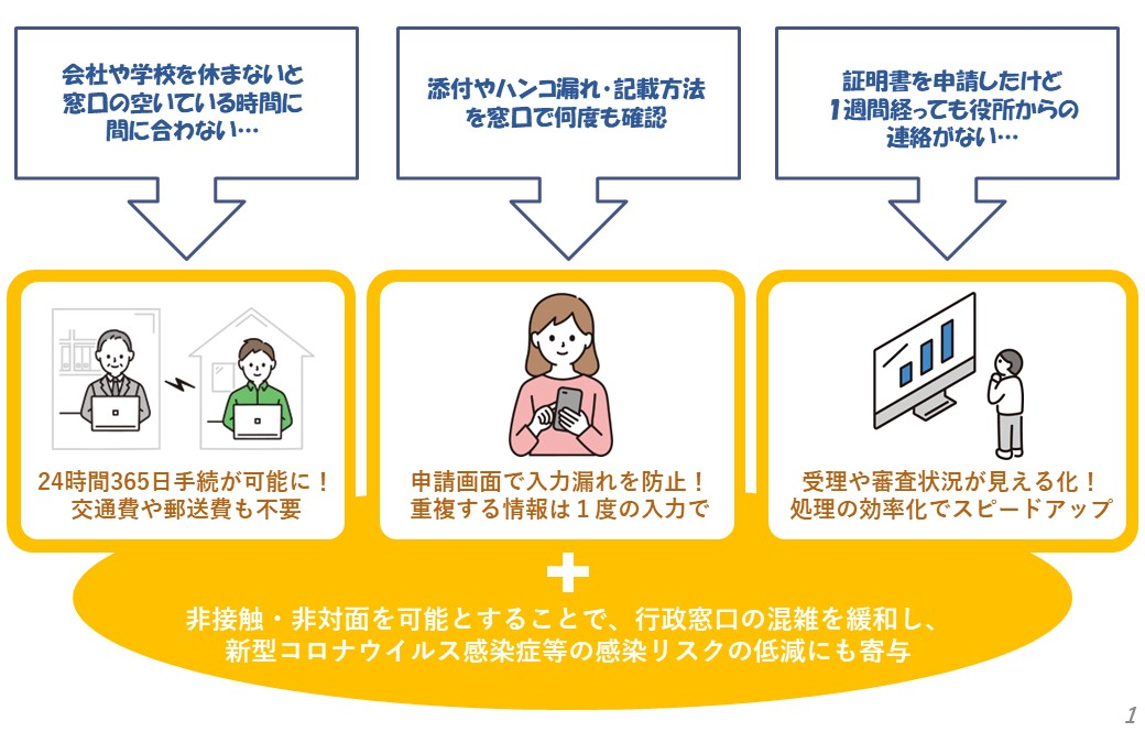 - 時間及び場所の制約がない申請・届出など、行政手続のデジタル化は、手続にかかる時間(コスト)の削減に大きく貢献するものである。さらには、非接触・非対面を可能とすることで、行政窓口の混雑を緩和し、新型コロナウイルス感染症等の感染リスクの低減にも寄与する。