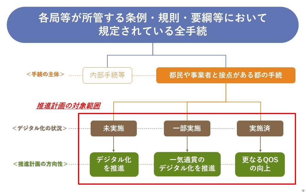 東京都の内部手続 - また、デジタル化が未実施の手続はもとより、既にデジタル化をしている手続についても、更なる利便性の向上を目指す手続として本計画の対象とした。
