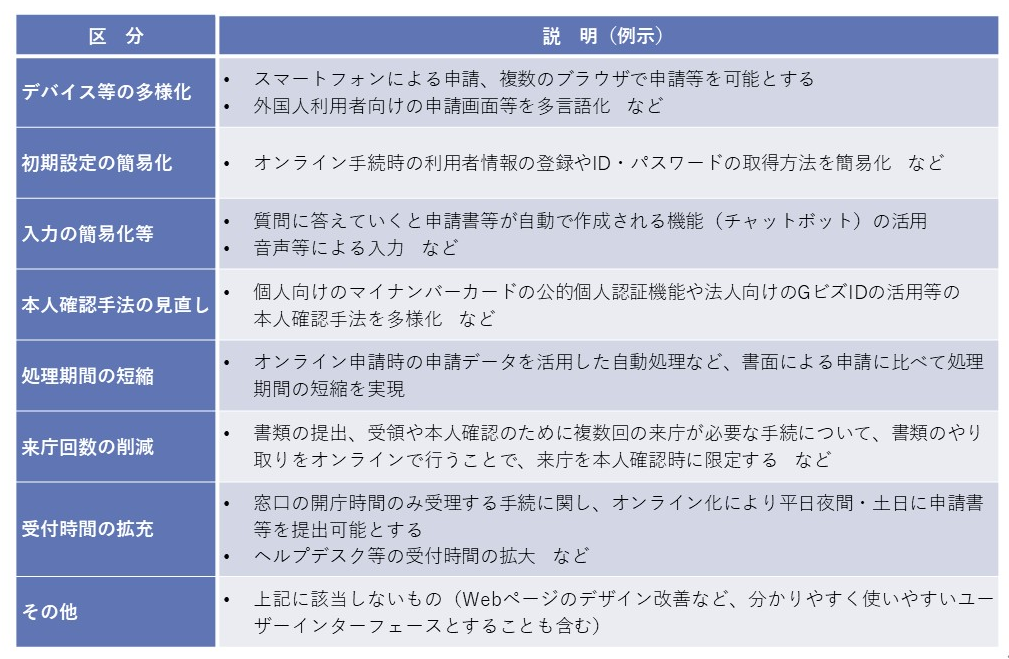 - 各局等は、新たにデジタル化を実現する行政手続だけでなく、既にデジタルで行っている行政手続においても、利用者視点に基づいた現状の把握と分析を行った上で、手続の一連の工程がデジタルで完結することを目指す。また、オンラインによる申請時の添付書類の省略や費用対効果等も踏まえてオンライン利用を促進する方策を検討し、利用者の利便性向上に取り組む。