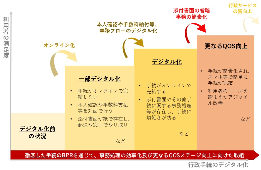 - こうした行政サービスの根幹ともいえる行政手続をデジタル化し、手続を行う際に利用者にかかる負担を減らすことは、都政のQOS、ひいては都民のQOL(クオリティ・オブ・ライフ)向上に大きく寄与するものである。