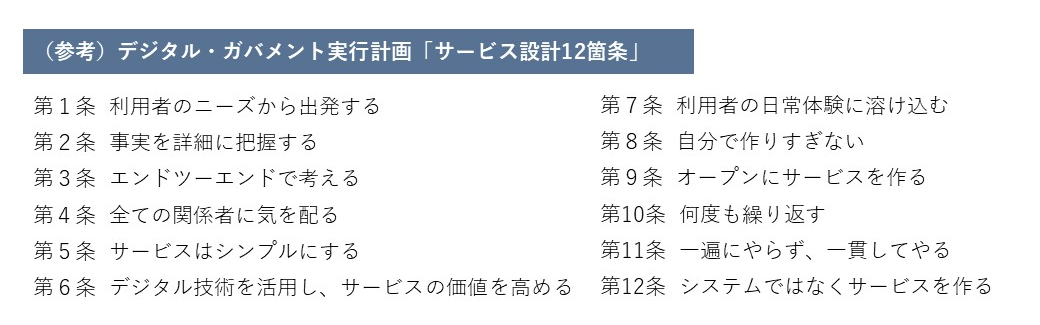 - 国においては、デザイン思考を具体化した「サービス設計12箇条」を掲げ、利用者中心の行政サービス改革を進めており、手続の利用者ニーズを把握・分析した上で「すぐ使えて」「簡単」で「便利」な行政サービスの実現を目指すこととしている。