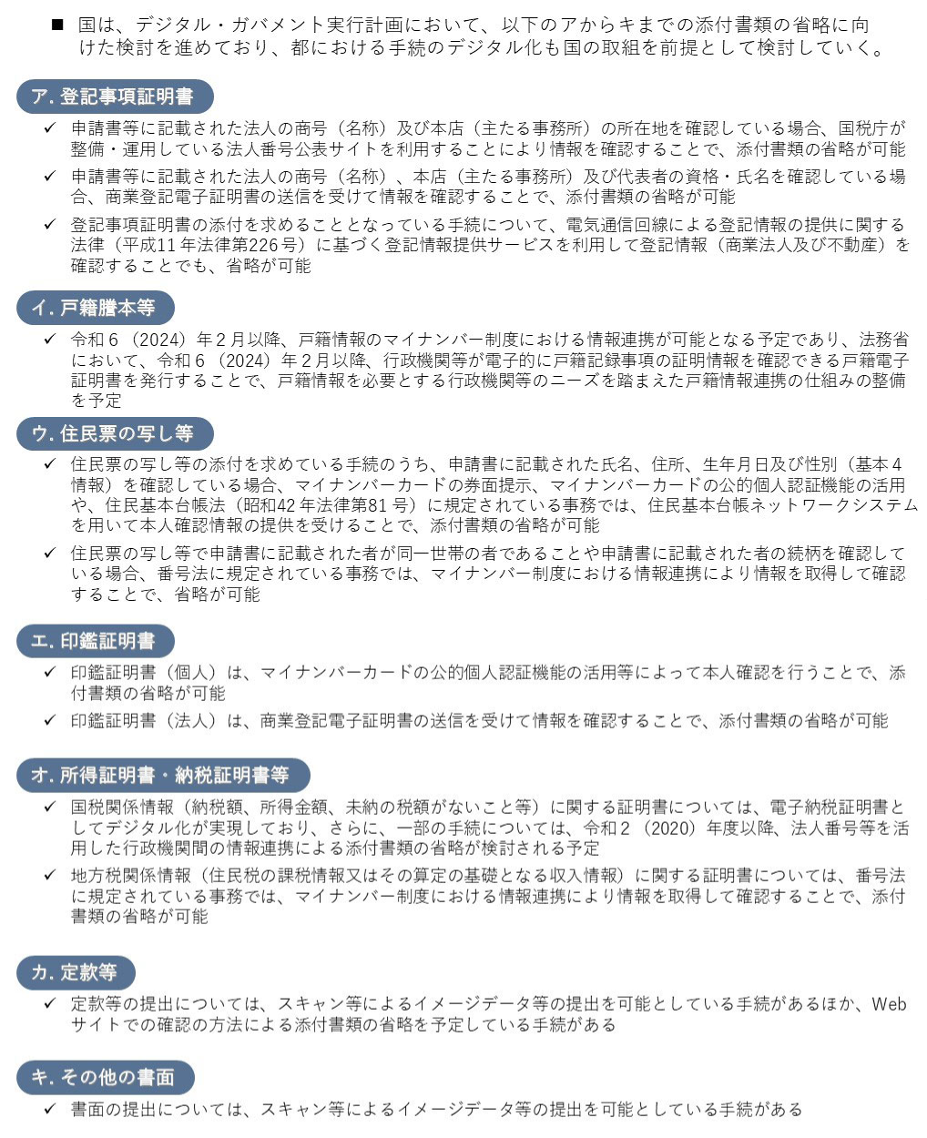 - 省略が困難な添付書類についても、オンラインで提出することを可能とするなど、可能な限り一連の手続がデジタルで完結するように取り組む。