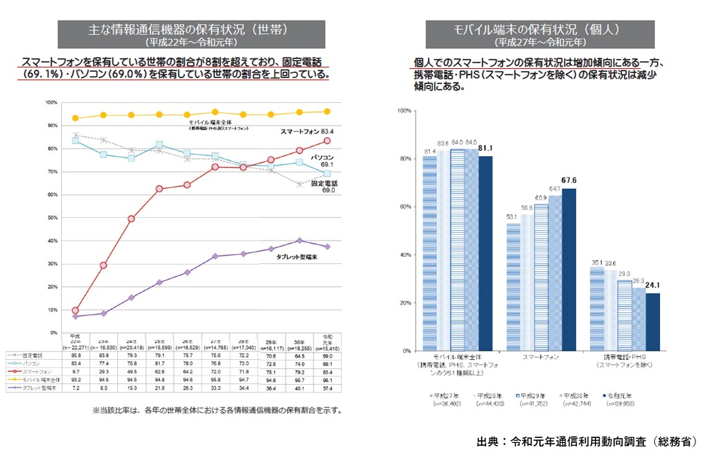 - 近年、スマートフォンの世帯保有率がパソコンの世帯保有率を上回っていることや個人のスマートフォンの保有率が増加傾向にある。