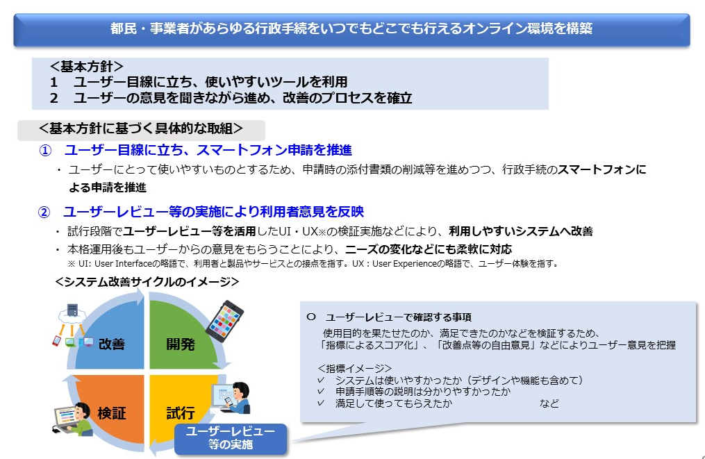 - なお、「東京共同電子申請・届出サービス」についても、スマートフォンにより手続を完結することができるよう、本人確認や手数料の支払いなどの関連する機能を強化していくとともに、利用者や専門的な知見を有する方々の意見を取り入れながら必要な改善を図っていく。