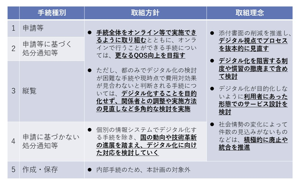 - 各局等が所管する東京都に係る手続(内部手続を除く。)において、年間件数が概ね1万件を超えるデジタル化が未実施の手続とその関連手続について、利用者視点に立ったデジタル化の方向性、具体的な検討内容、デジタル化の実施時期等を詳細に明示し、優先的にデジタル化を進めていく。