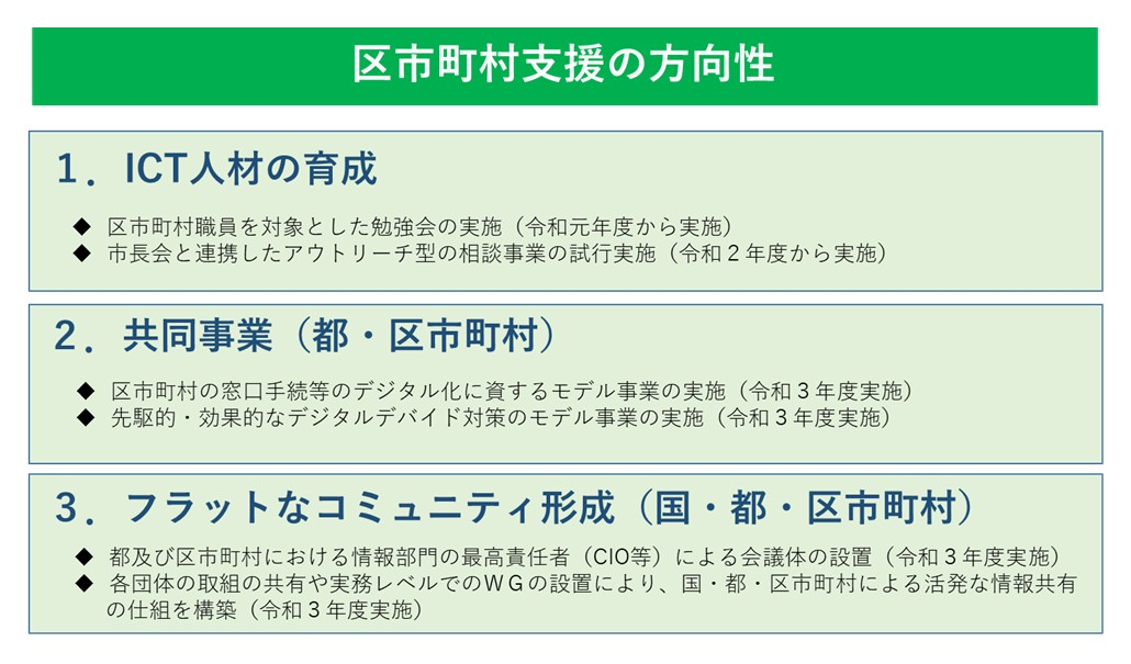 - 手続のデジタル化に当たっては、必要に応じて区市町村とも積極的に連携を図り、利用者視点の見直しを進めるとともに、区市町村の取組に対して必要な支援を実施する。